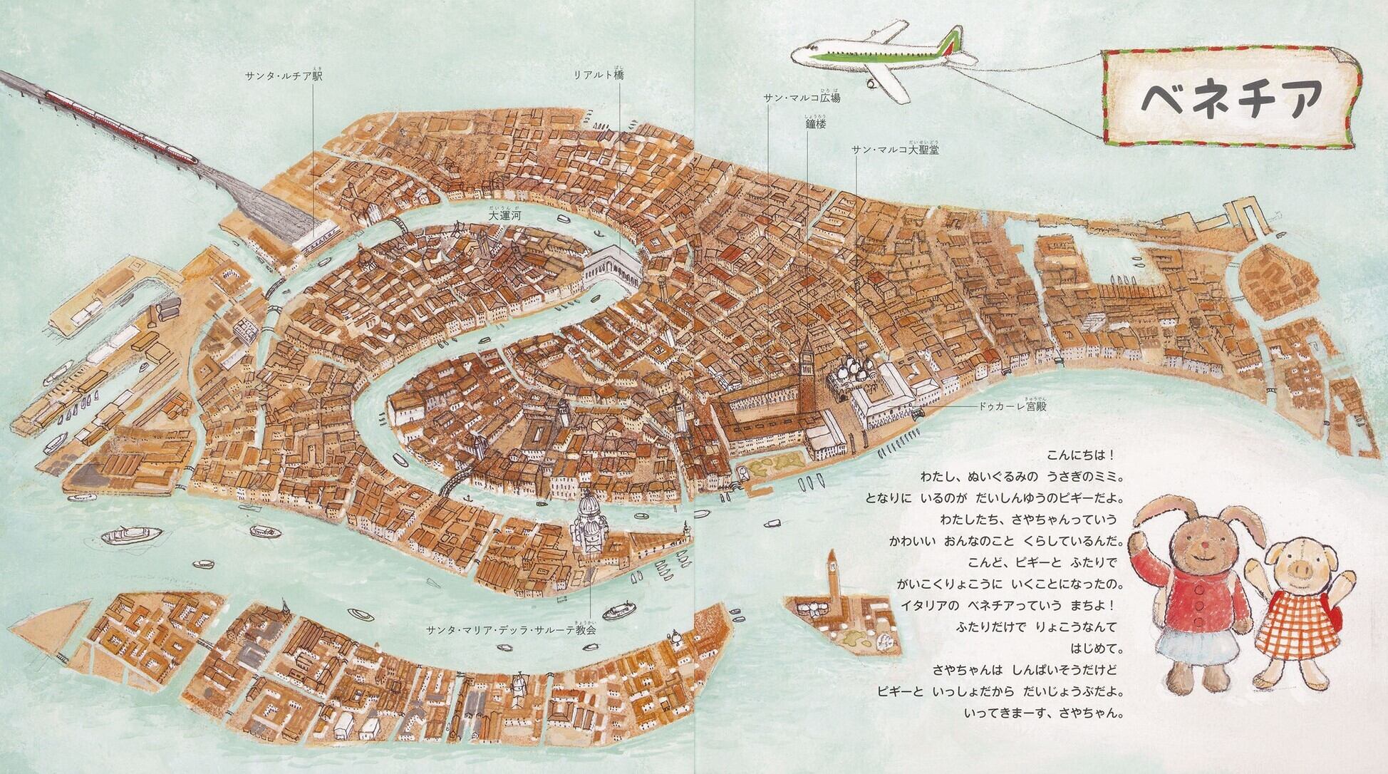 さやちゃんのぬいぐるみの、うさぎのミミが大親友のぶたのぬいぐるみのピギーが、イタリアのベネチアへ旅行に行きます。飛行機で12時間、それから電車に乗り換えて、ついにベネチアに到着!