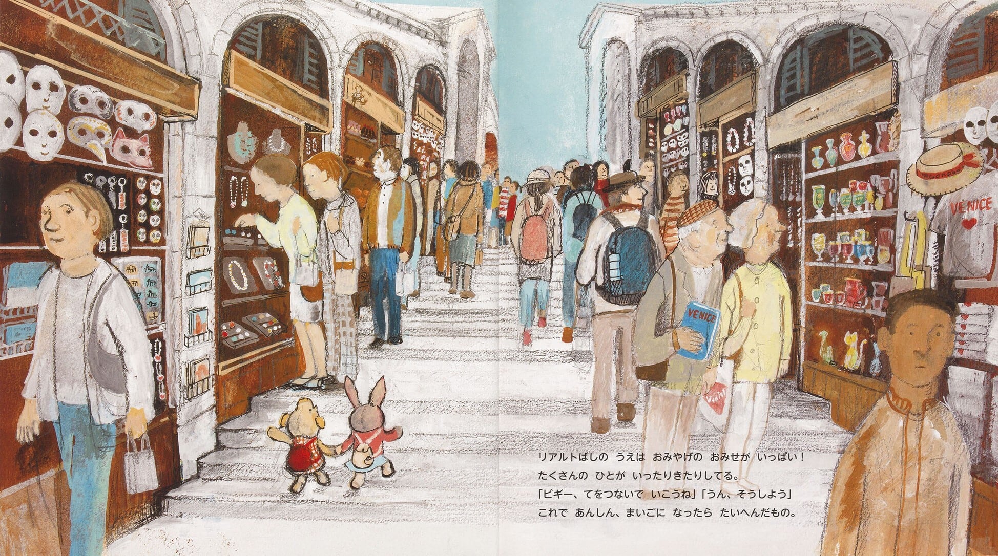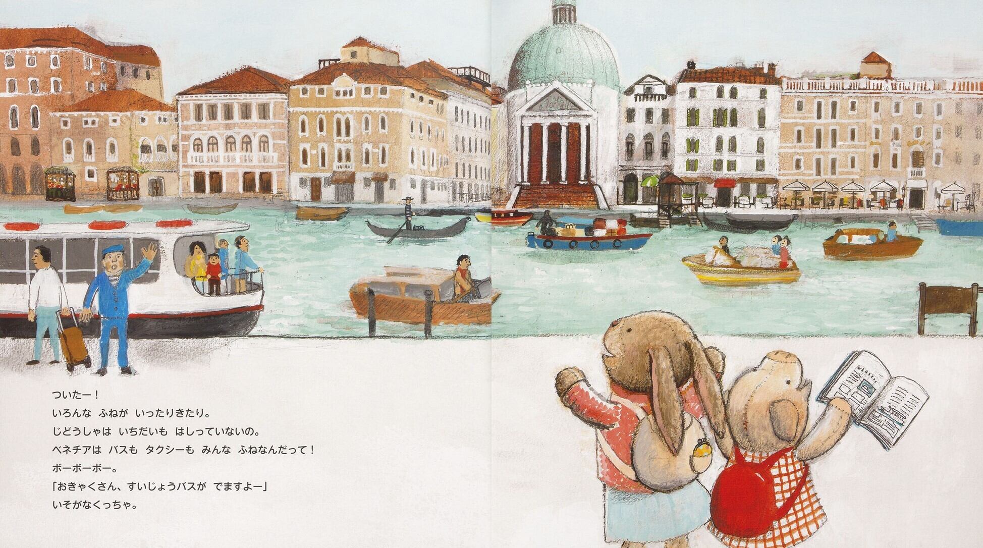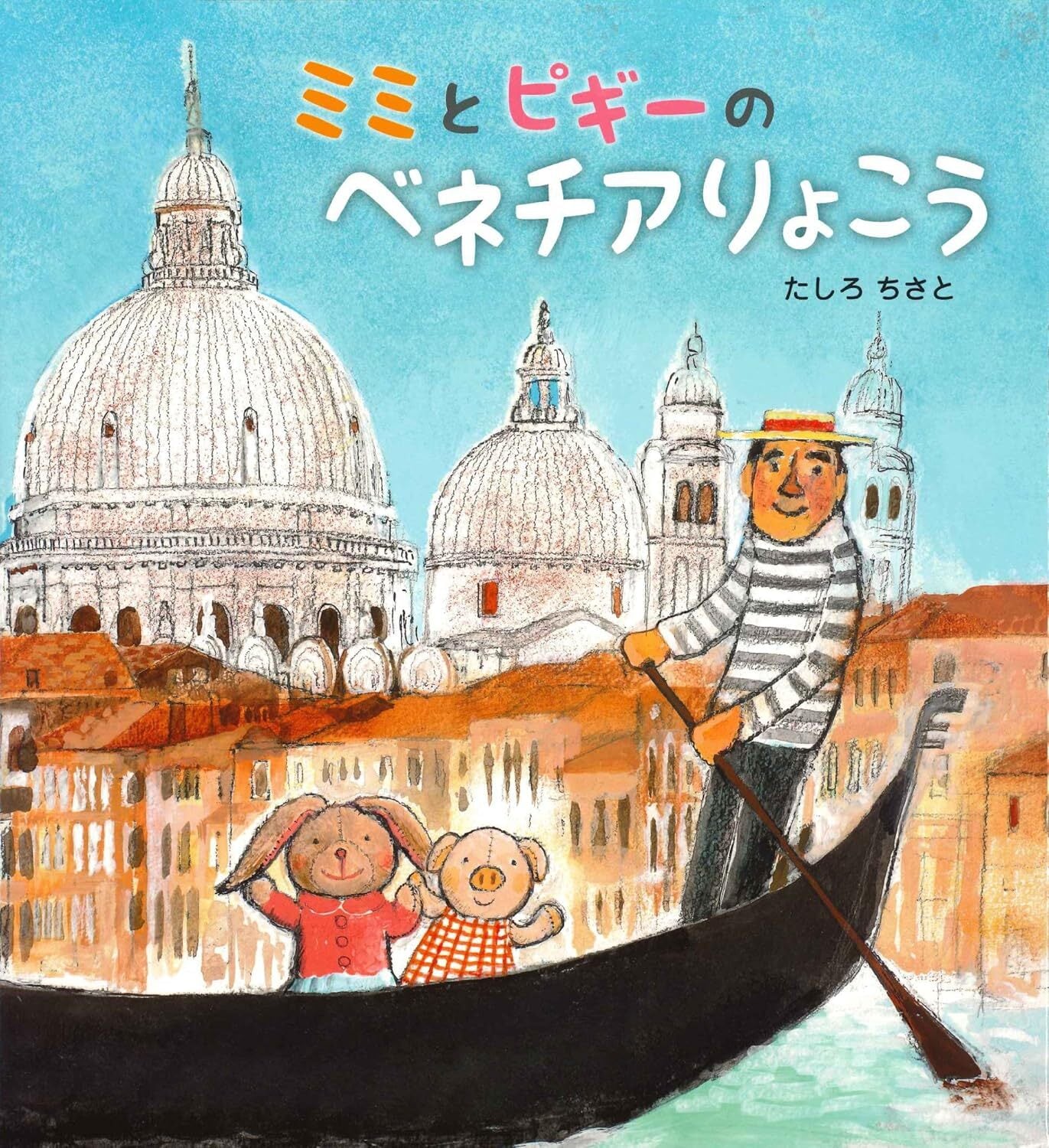 「まだまだ勉強不足だなぁ」と、たしろちさとさんの絵本を少しずつ仕入れていくなかで、今作『ミミとピギーのベネチアりょこう』に出合い、2014年にイタリアのボローニャで開催される「ボローニャ・チルドレンズ・ブックフェア」でイタリアに行ったこともあり、街並みなども似たところもあり、懐かしく眺めていました。