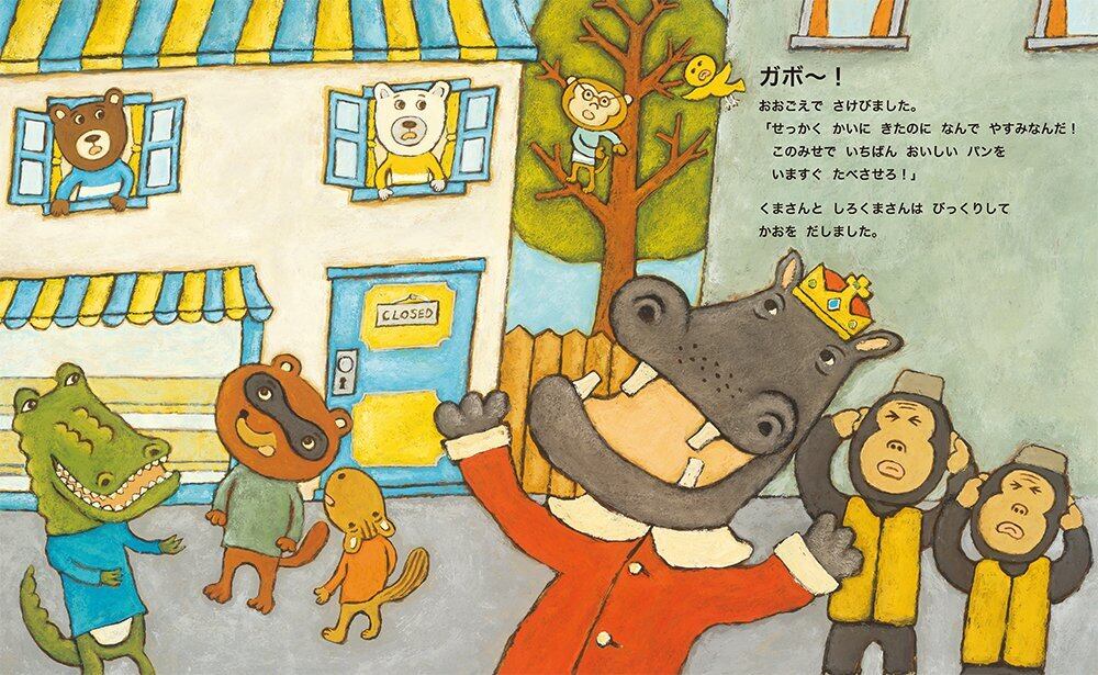 まわりの動物たちが心配していると、かばの王様が「まかせなさい」と立ち上がり…。おいしいパンをめぐって起こるお話が、劇のように読める絵本です。