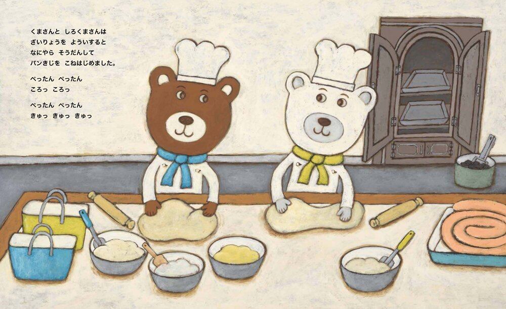 くまさんは大きなクリームパン、しろくまさんは長ーいソーセージパンをつくります。