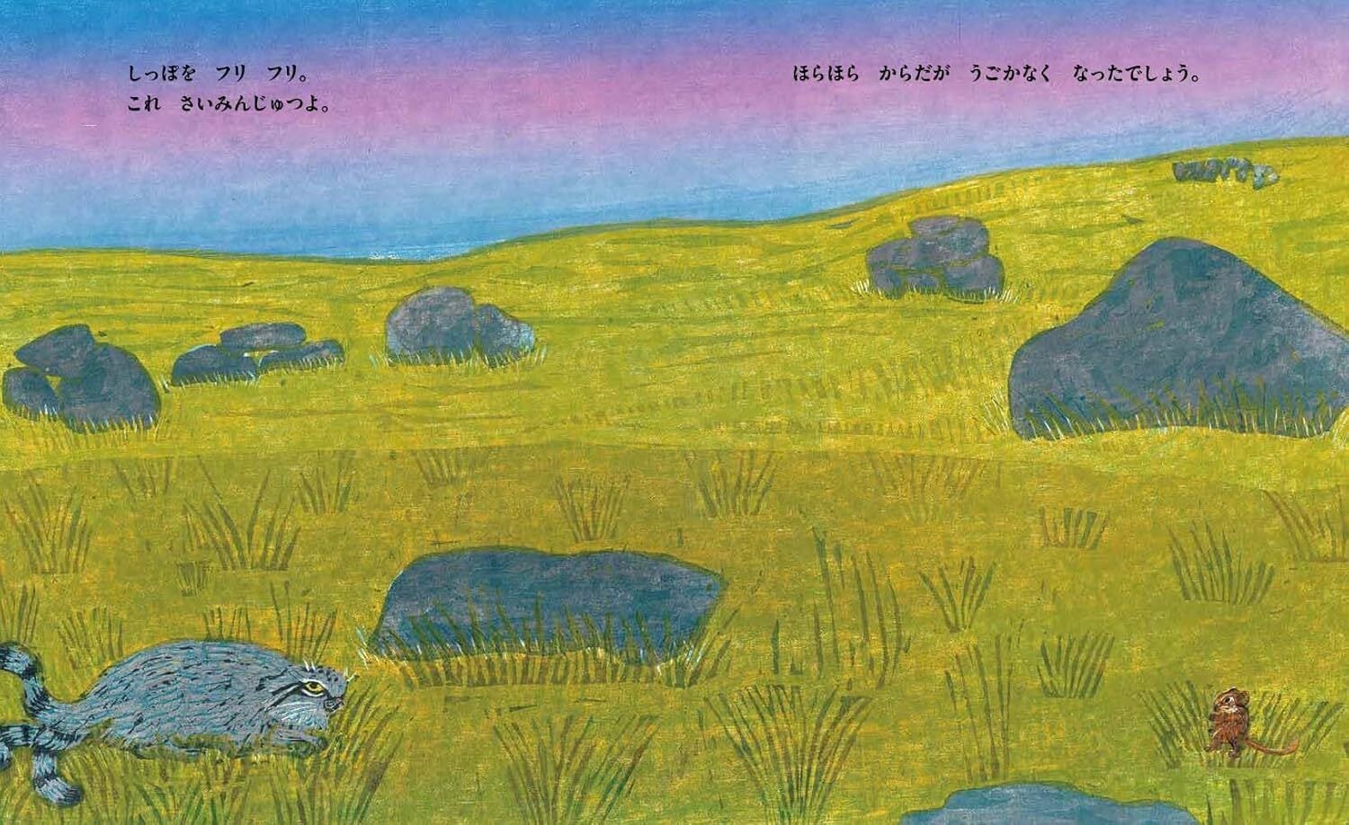 「サーッ」と流れていくように読んでいるつもりでも、たまに妙に気になったりと、マヌルネコだけあって不思議な感覚の絵本です。