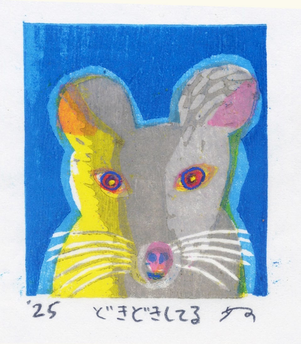 たけがみたえ木版画【額装済み】「どきどきしてる(クマネズミ)」