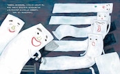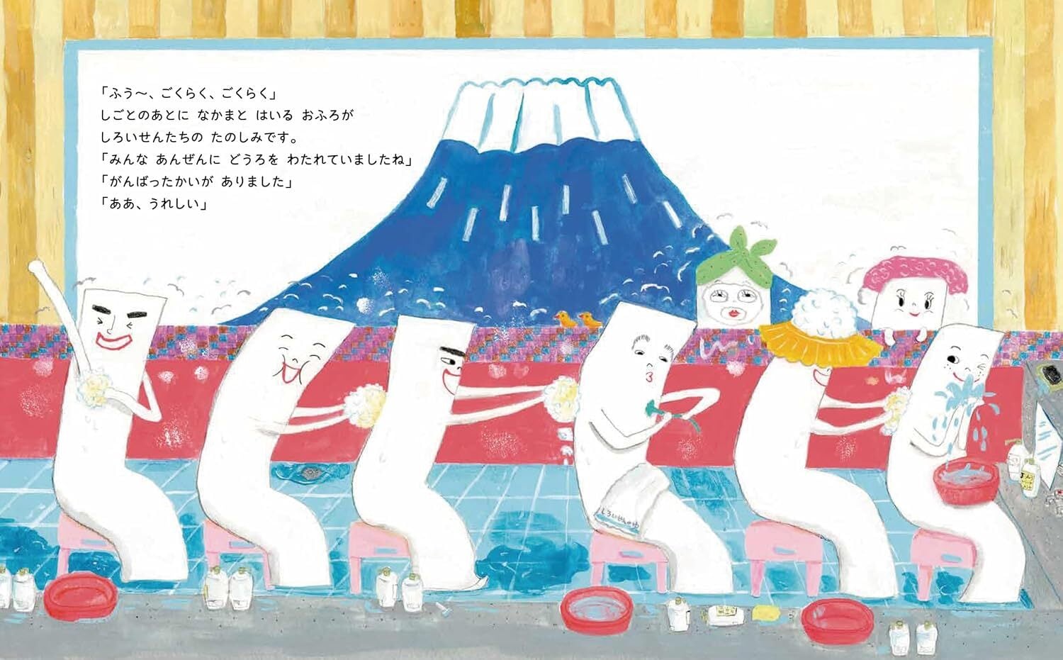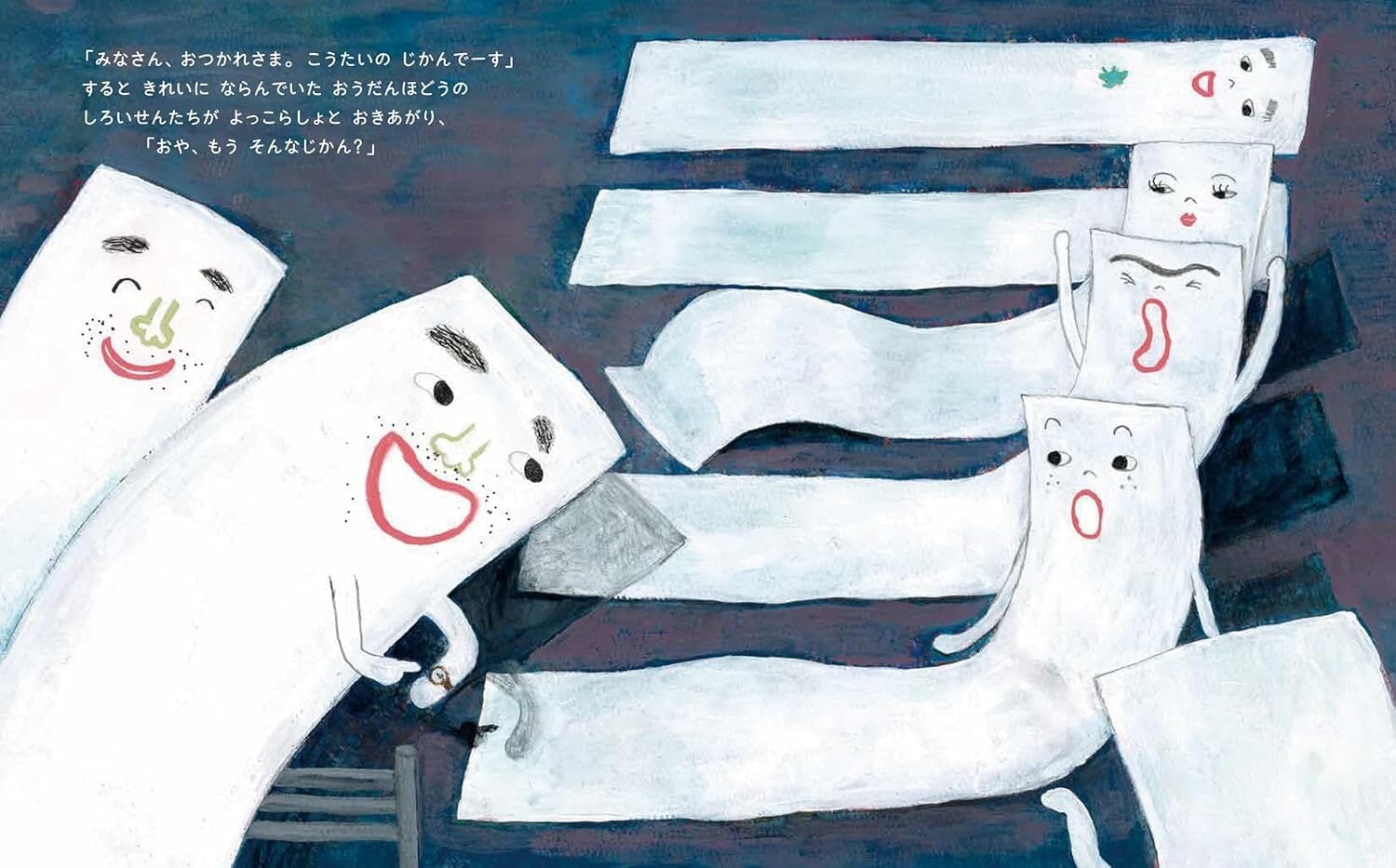 すると綺麗に並んでいた横断歩道の白い線たちが起き上がります。そう、交代の時間です。仕事を終えた白い線たちは、今日起こった出来事などを話しながら銭湯へ出かけます。仕事の後に仲間と入るお風呂が楽しみなのです。