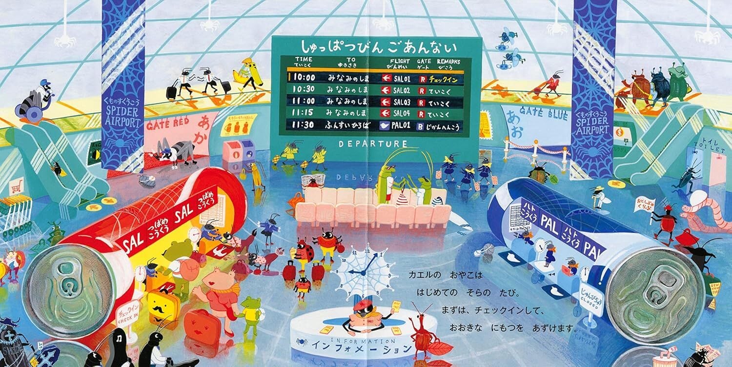 カエル親子以外にも、いろいろな虫の乗客や、ユニークな世界観の空港や町のようすなど、すみからすみまで詳細に描かれた絵は何度読んでも新しい発見があり、親子で読んでも楽しめます。