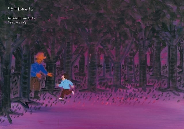 とにかく色彩が美しく、各ページが1枚の絵として成立しています。僕も息子がいますが、父の子どもへの愛情、子どもの父への絶大なる信頼を感じます。この絵本が発刊された当時(2021年)、5才だった息子と一緒にこの絵本を読み、息子と近くの森のある公園に行って「とうちゃん、おーい!」との呼びかけに「おーい」と返事をする『はるのひ』ごっこをしたものです。