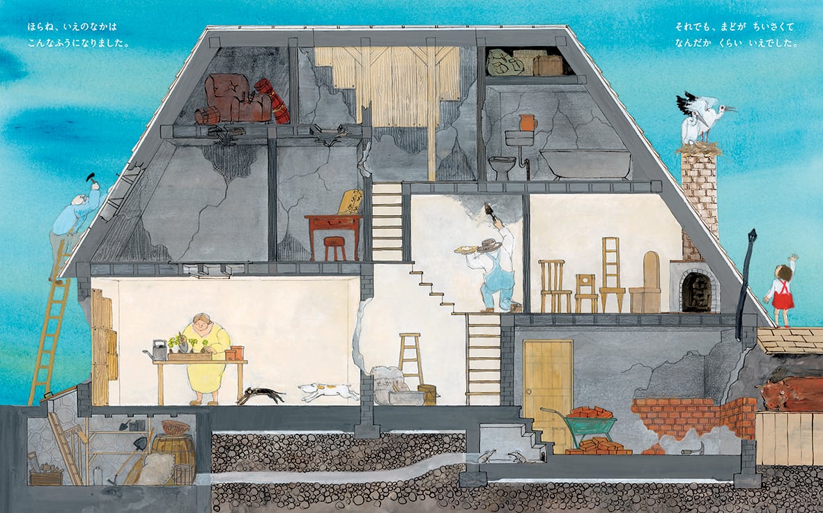 随所に変わりゆく家の断面図が細部まで描かれており、それを見るだけでも楽しい絵本です。