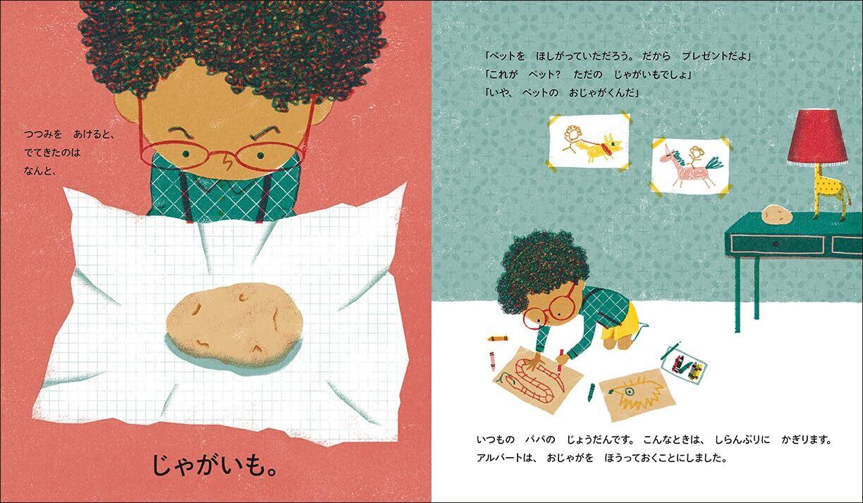 ある日、パパから青い紙に包んでリボンをかけたプレゼントをもらいました。包みを開けてみると出てきたのはジャガイモ。ペットを欲しがっていたアルバートへのパパのいつもの冗談です。