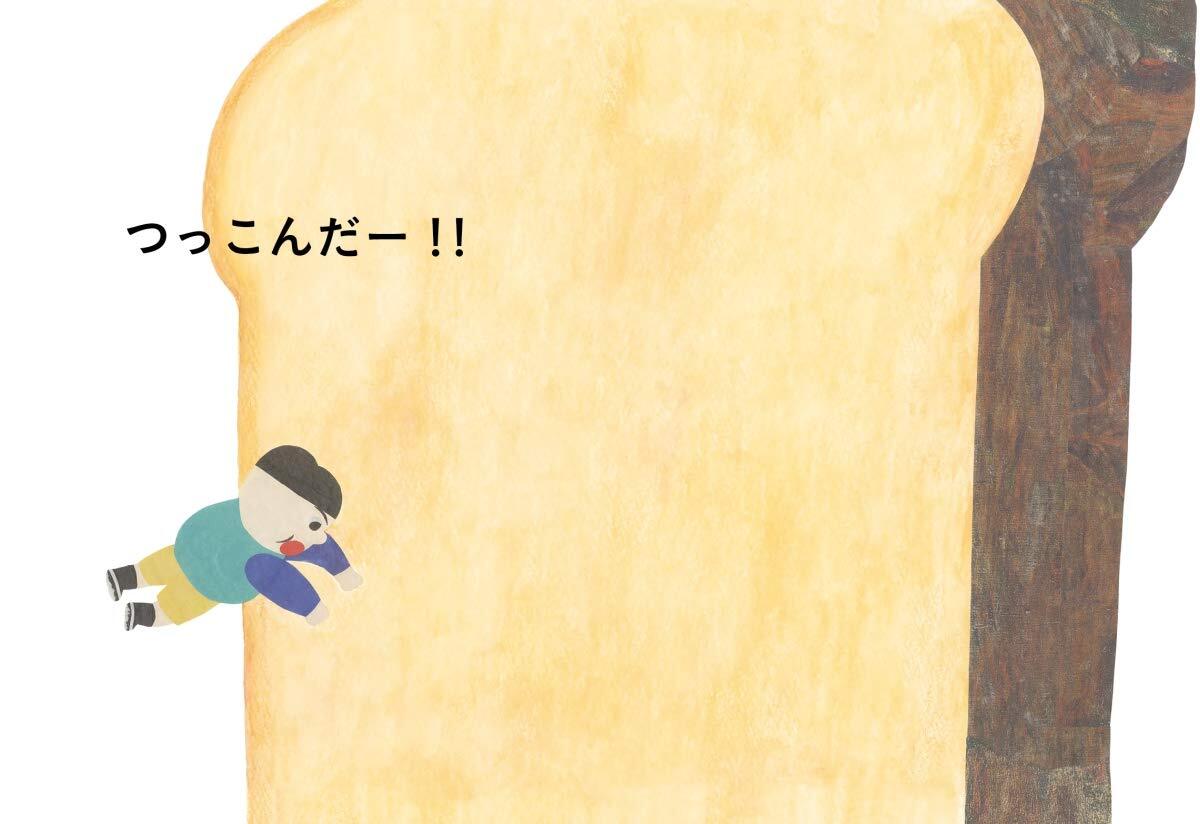 誰かがこっちに向かって走ってきます。この子どもの名前はタロー君です。とにかく食べまくります!食パンの壁に向かって走ってきますが止まる気配はありません。「このまま どーする。」