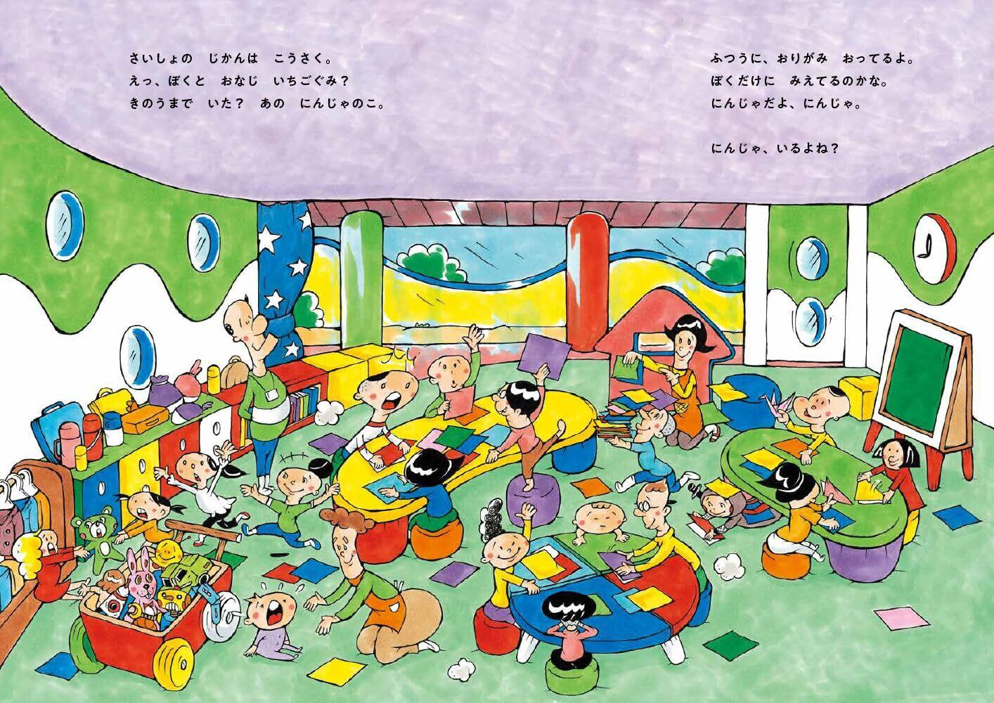 最初の時間は工作ですが、忍者も同じいちごぐみのようです。普通に折り紙を折っていますが、誰にもやはり誰にも見えていないようです。工作の時間だけでなく、歌の時間、プールの時間、お昼ご飯、運動場で遊ぶ時間、お昼寝の時間なども忍者はいるのに誰も気付きません。